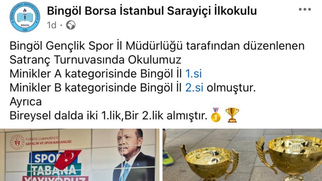 Bingöl Gençlik Spor İl Müdürlğü tarafından 31.05.2025 tarihinde yapılan Okul Sporları Satranç Turnuvasında okulumuz takım olarak;
